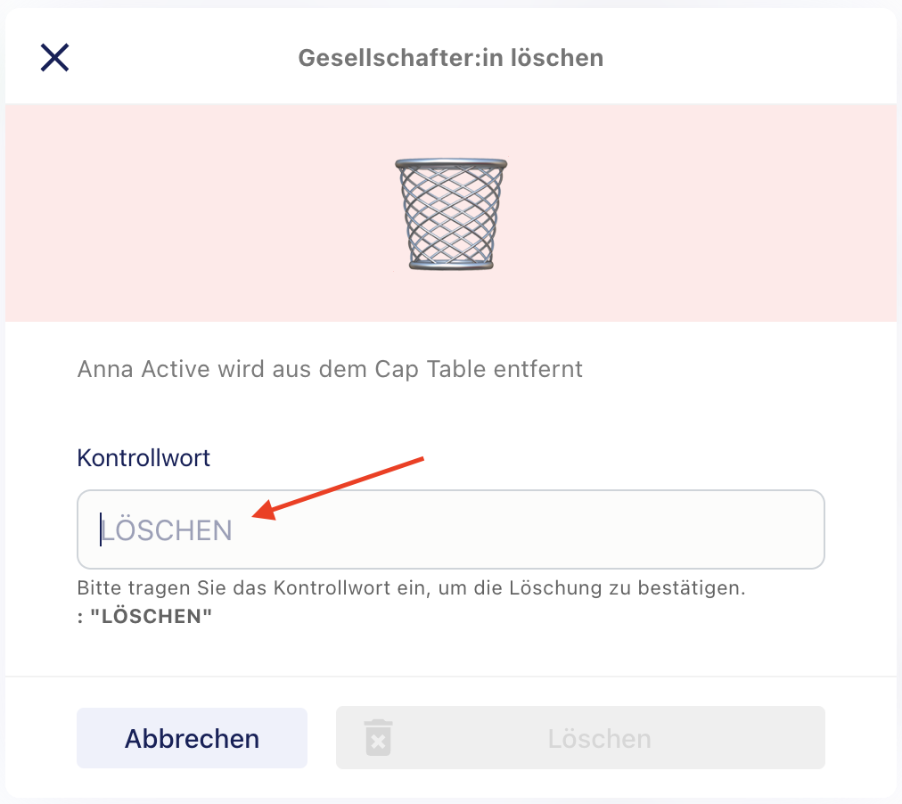Beachte: Der/Die gelöschte Gesellschafter:in kann weiterhin die Beschlüsse und Meetings sehen, in welche er/sie in der Vergangenheit involviert war.