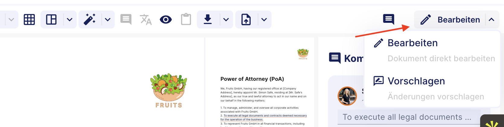 Du kannst im Document Builder auswählen, ob du im Vorschlag- oder Bearbeitungsmodus arbeiten möchtest.