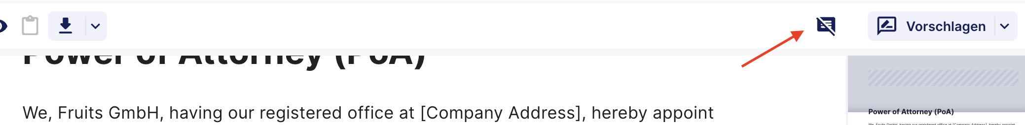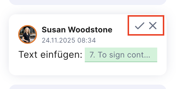 Du kannst Vorschläge direkt im Document Builder annehmen oder ablehnen. Gehe hierfür entweder auf das Häkchen oder auf das Kreuz, um die Änderungen anzunehmen oder abzulehnen. Angenommene Vorschläge werden direkt im Dokument entsprechend angepasst.