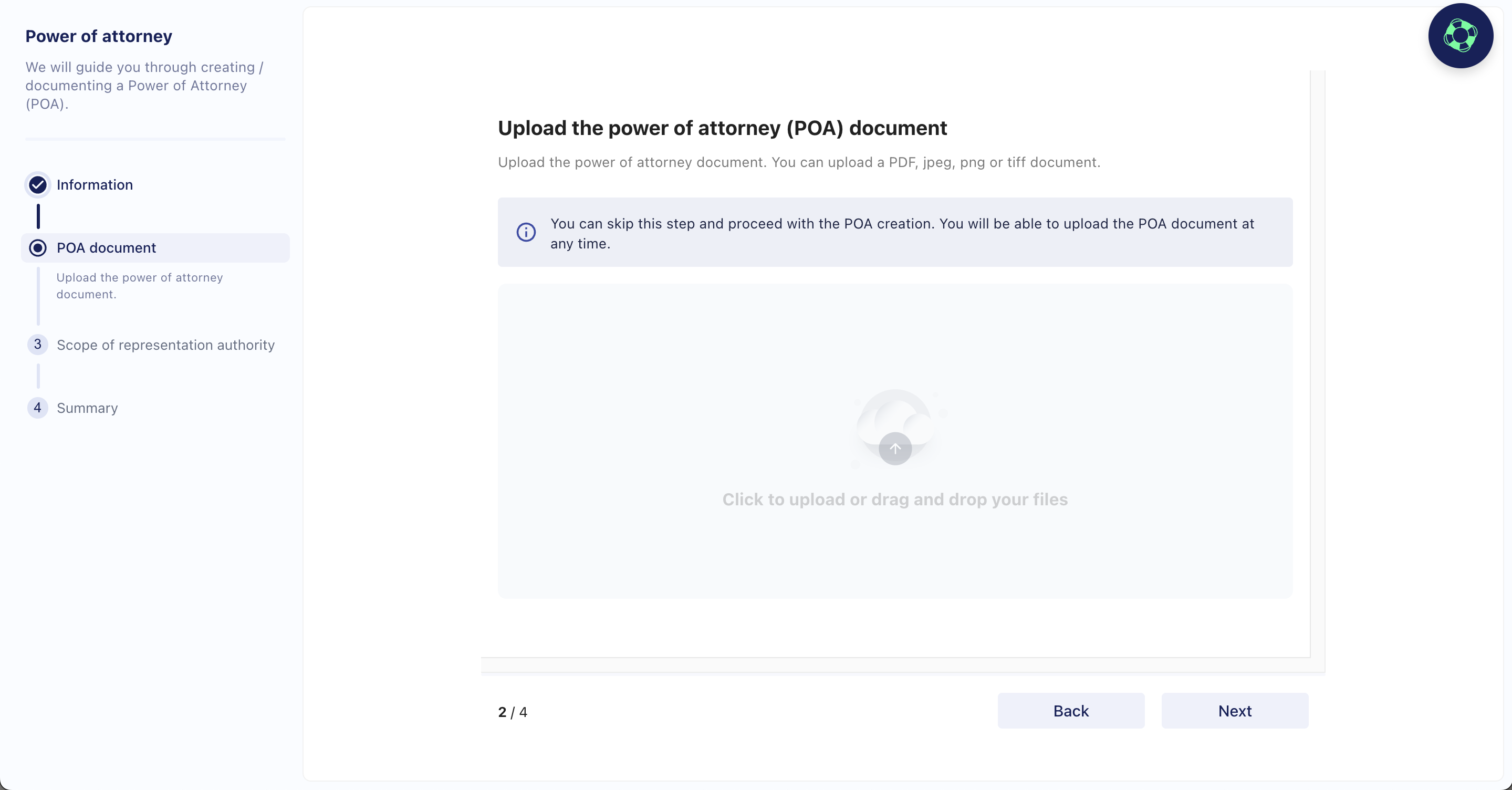 Enter the required information in the fields provided and then click on continue. You can also upload a power of attorney document immediately or later.