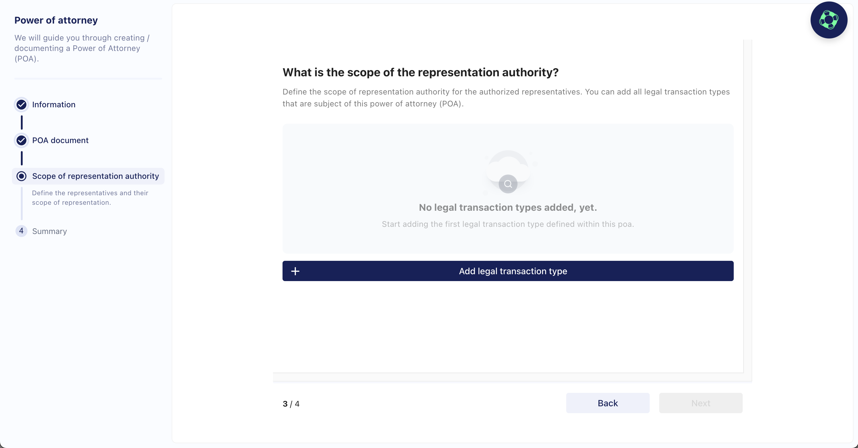 In the next step, you must add a legal transaction type. Here you can either select legal transactions that have already been created or create a new type.