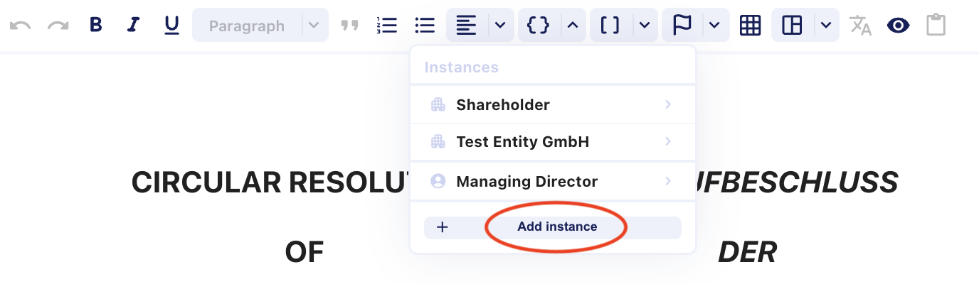 To add a new intelligent placeholder, simply click the "Add Instance" button. You can choose to add either a legal entity or an individual. We recommend configuring these placeholders within the document template for easier setup and consistency.